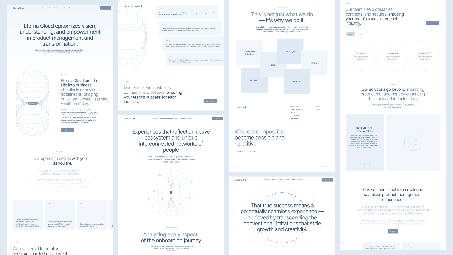The layout didn’t start from a wireframe. It started from a feeling. A doc, written by Anastasiia after her first deep dive into EternaCloud. Pages of notes trying to translate the intangible into something you could design against. Because EternaCloud didn’t come in saying “we need a landing page.” They came in with concepts—big ones. Circles. Flow. Unity. It was on us to take that cloud of insight and build something structured enough to hold it.