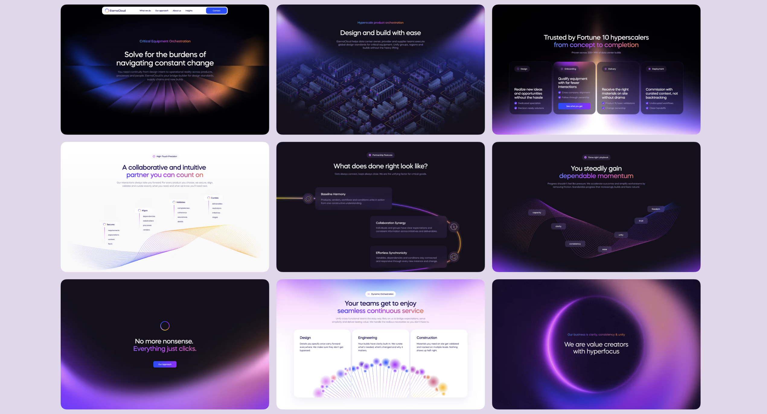 We were designing a structure that made the invisible parts of EternaCloud feel real. The site was abstract by nature. You can’t photograph orchestration or show someone “seamless deployment across providers” in a carousel. So yes—we used UI tricks. A lot of them. But not to distract. To reveal.