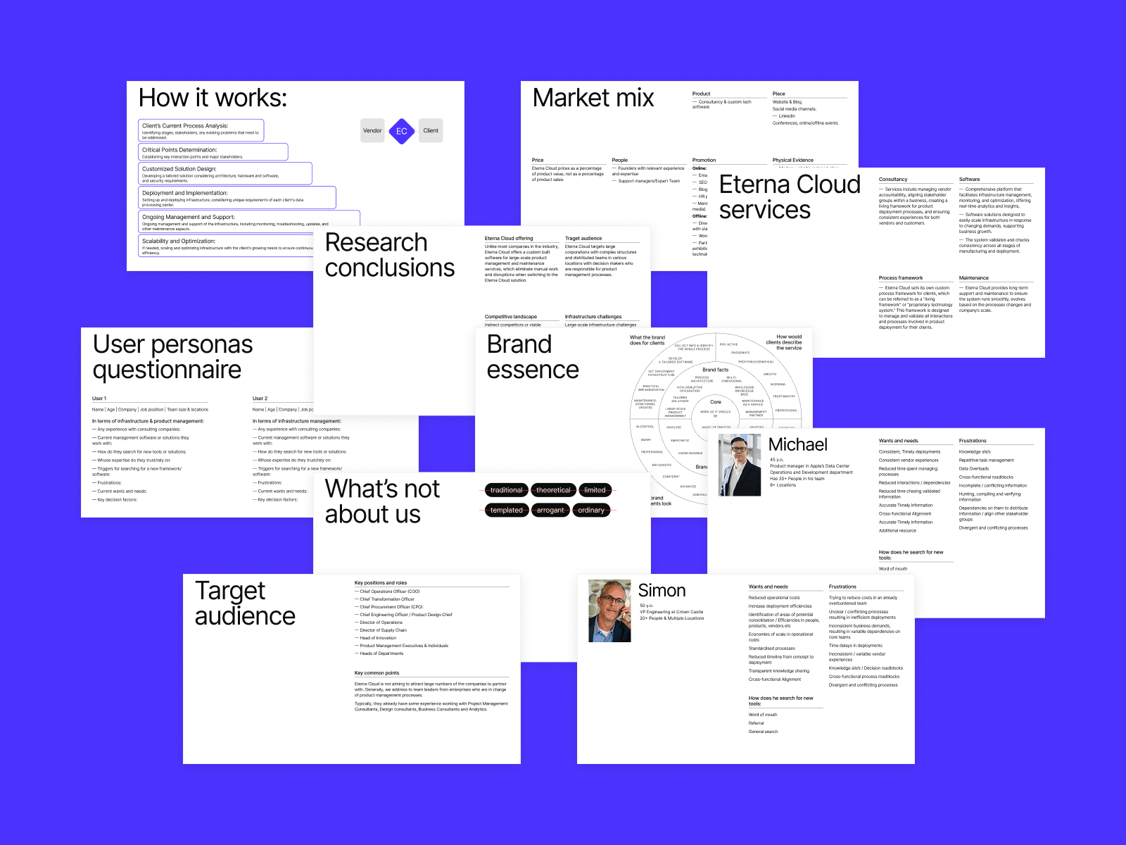 EternaCloud came prepared, with 2+ years of internal research. They knew their audience, their positioning, even their visual preferences. Our brand strategist, Olya Zakharyan, filtered all of that into a core brand model.