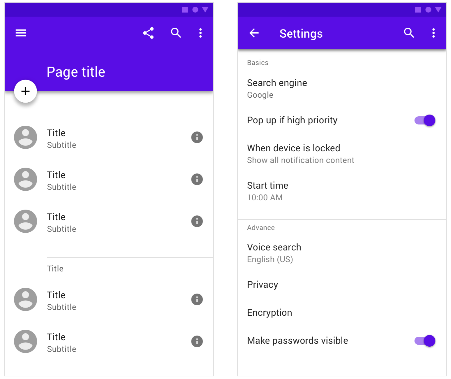 Examples of dividers paired with subheaders in mobile app design